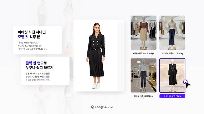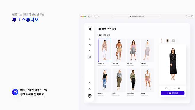 AI 가상 착장 서비스 ‘루그 스튜디오’ 개발에 들어갔다. 가상의 모델이 의류 아이템을 착장한 이미지를 생성하는 플랫폼이다. “이전에 개발한 시착 모델은 2D 이미지를 기반으로 하고 있어서 옷의 핏까지는 구현하지 못했는데요. 이 2D와 3D 사이의 간극을 좁히는데 주안점을 뒀습니다. 마네킹에게 옷을 입힌 후 이 이미지를 인간 모델로 대치시키는 방식으로 왜곡을 최소화했어요. 궁극적으로는 모델과 옷을 선택한 후 원하는 포즈를 입력하면 모델컷이 생성되는 플랫폼을 목표로 하고 있습니다.”