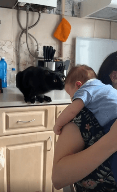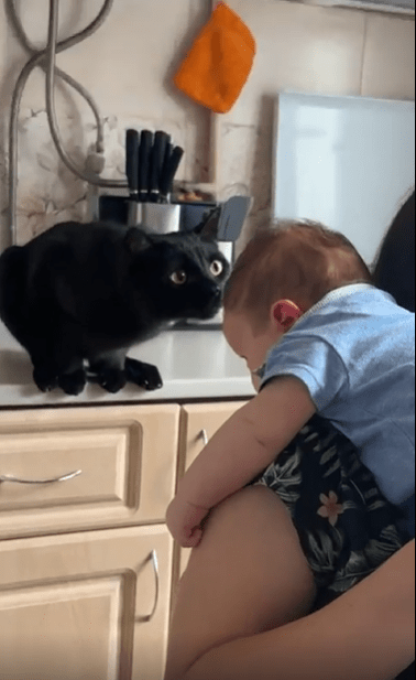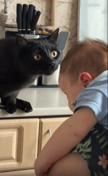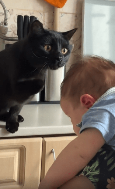 터치를 마친 고양이는 이내 가만히 아기를 바라봅니다. 마치 “좋아, 넌 합격”이라도 말하듯 말이죠. 그 모습은 보는 이에게 미소를 짓게 하는 동시에, 이 조용한 생명 간의 교감에 따뜻한 감정을 불러일으킵니다.