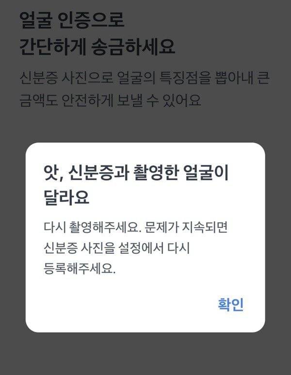 26일 금융업계에 따르면 토스뱅크의 경우 1회 1000만원 초과, 1일 5000만원 초과 금액을 이체할 경우 얼굴인증을 해야 한다. 이때, 가입시 등록한 신분증과 내 얼굴을 비교하게 되는데 이 과정에서 신분증 얼굴과 촬영한 얼굴이 다르다는 오류가 발생하는 사례가 빈번하다는 후문이다.