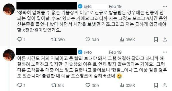 토스뱅크의 얼굴인식 오류는 하루이틀 문제가 아니다. 지난 연말부터 소셜미디어 X(이전 트위터)나 인스타그램 등에서 사용자가 자신의 불편을 겪은 내용을 올리기도 하고, 관련 커뮤니티나 블로그 등에는 “토스뱅크에서 얼굴인증 오류, 어떻게 하나요?”와 같은 문의나 민원글이 쇄도하고 있다.