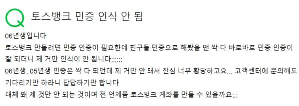 특히 올해 신규 발급된 신분증의 경우 이같은 오류가 더욱 빈번한 것으로 나타났다. 인증 완료까지 한 달 이상 소요된 경우도 있었다. 토스뱅크 측은 신규로 발급받은 신분증의 경우 ‘기술상의 이유’로 인증이 안 될 수도 있다고 응대하고 있다.