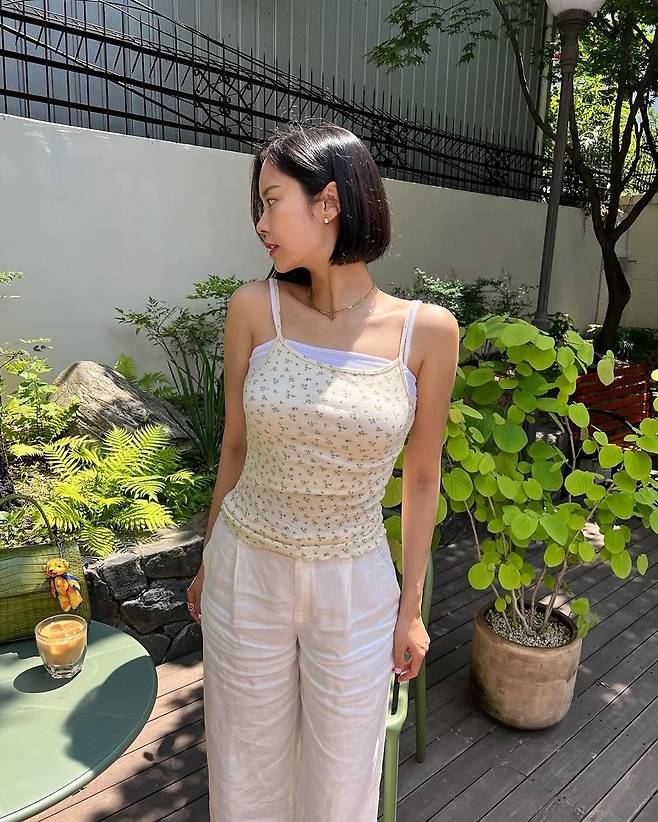 상의는 은은한 플라워 패턴이 더해진 크림 컬러 슬리브리스 탑으로, 핏되는 실루엣이 김주희의 매끈한 팔 라인을 강조한다. 여기에 흰색 이너웨어가 겹쳐 보여 시원한 레이어드 느낌을 더하며, 전체적으로 페미닌하면서도 편안한 무드를 자아낸다. 하의는 허리 밴딩이 더해진 와이드핏 린넨 팬츠로, 가벼운 소재감 덕분에 활동성과 스타일을 동시에 잡았다.