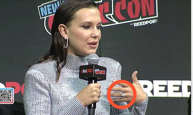 20일(현지 시간) 미 매체 '페이지식스(Page Six)'에 따르면 밀리 바비 브라운이 배우 제이크 본조비(Jake Bongiovi)와 결혼한 후 첫 공개석상인 뉴욕 코믹콘 행사에 등장해 두 개의 웨딩 반지를 자랑하며 주목받았다. 화려한 결혼반지를 레이어드해 착용한 모습에 많은 사람의 관심이 쏟아졌다는 후문.