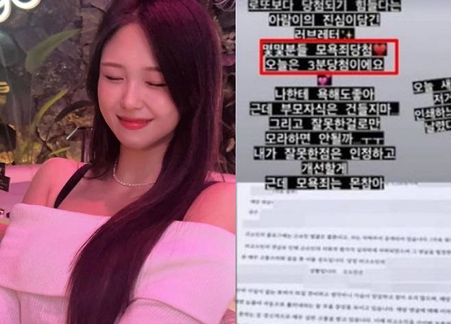 이어 조아람은 "몇몇 분들 모욕죄 당첨, 오늘은 3분 당첨이에요. 나한테 욕해도 좋아. 근데 부모자식은 건들지마"라고 경고했다.