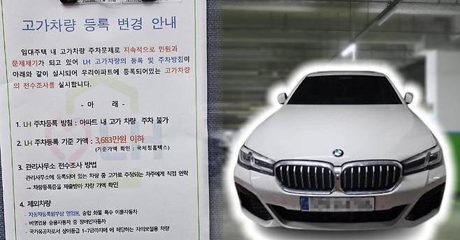 이에 한 임대주택에서는 '고가차량 등록 변경 안내'라는 공지문을 엘리베이터에 써 붙이며 온라인상에서 화제가 되었다. LH 주차등록 방침은 ' 3683만원이 넘는 고가 차량은 아파트 단지 내 주차가 불가하다'라고 안내하였다.