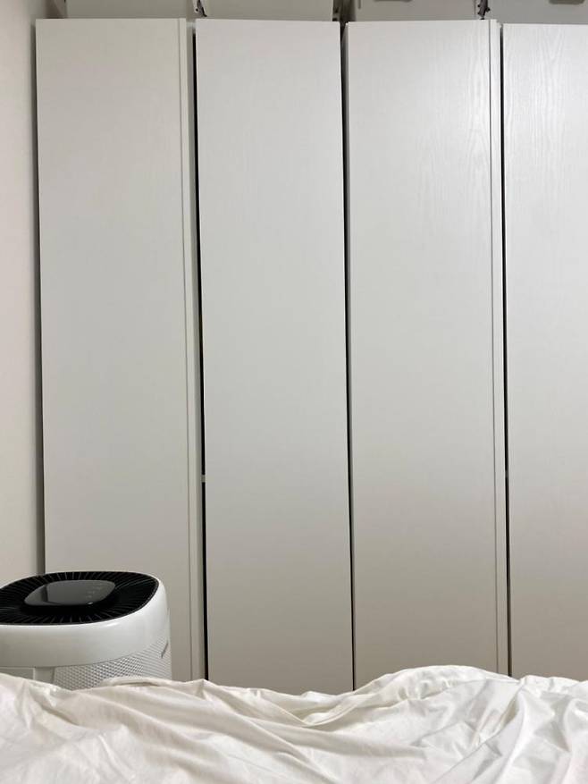 저렴한 제품이긴 하지만 흰색에 민무늬로 되어있어서가구 존재감을 드러내지 않고 벽 같은 느낌이라 맘에 듭니다.
