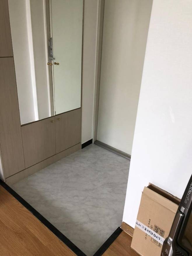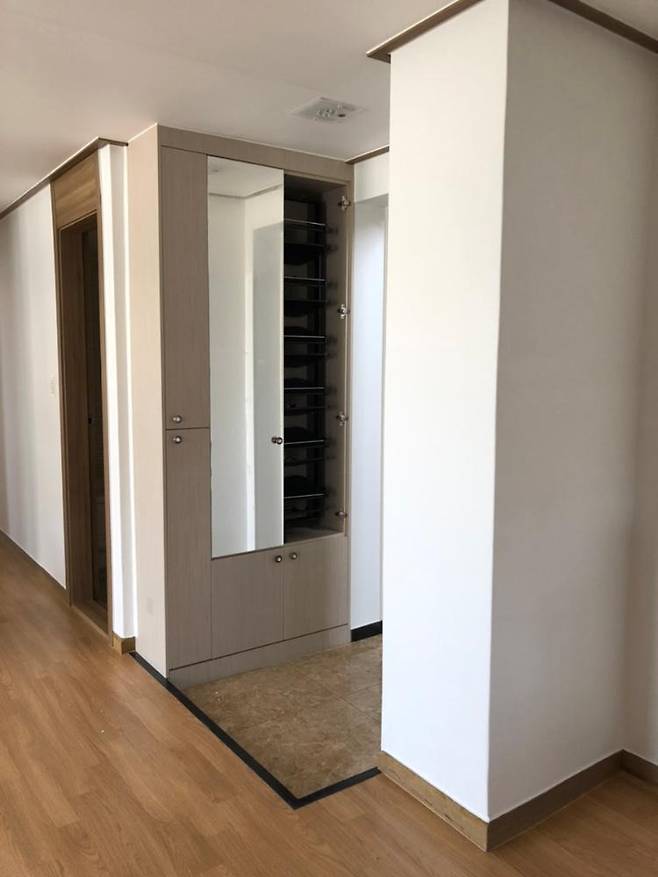 여기를 밝고 환한 현관으로 만들고 싶어서 스티커 타입의 단단한 마블 모양 타일을 찾아내 설치하고, 신발장도 하얀 페인트칠 + 골드 손잡이 설치, 그리고 마지막으로 중문을 설치했습니다.