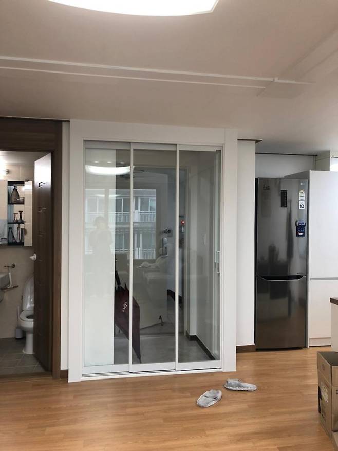 좁은 공간이다 보니 답답해 보이지 않게 하려고 나름 신경 써서 제일 얇은 틀로 3단 슬라이딩 디자인으로 골랐고, 유리도 망입유리 같은 거 하고 싶었는데 그냥 올 투명으로 결정했어요.