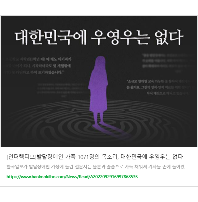 ▶인터랙티브 바로가기: 클릭하시면 1,071명 설문조사 결과 전체를 보실 수 있습니다. 클릭이 되지 않으면 주소(https://interactive.hankookilbo.com/v/disability/)를 복사해서 검색창에 입력해주세요.