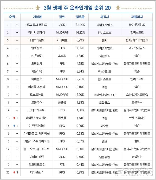 3월 셋째 주 온라인 게임 순위에서 '리니지 클래식'의 상승세가 이어진 가운데 '디아블로 4'가 차트에 재진입했다.