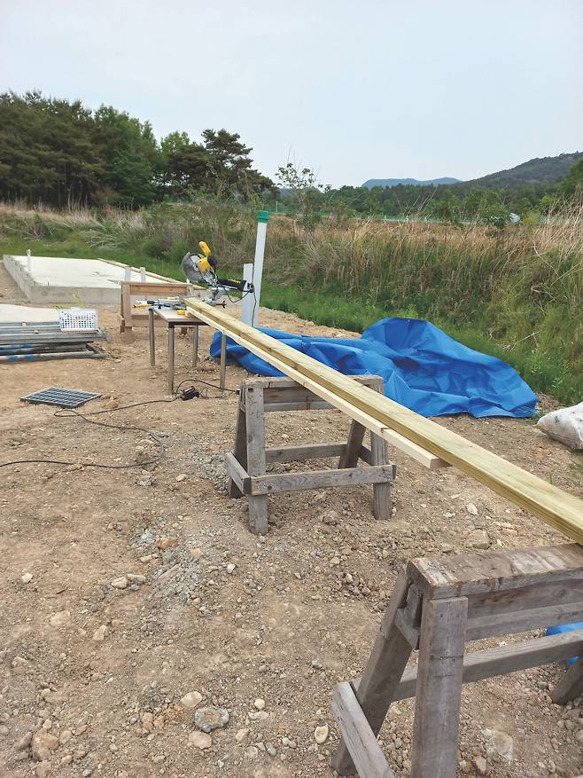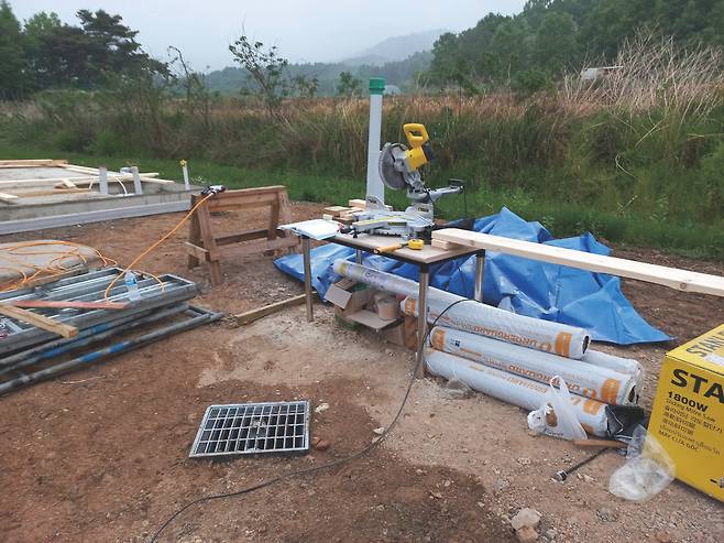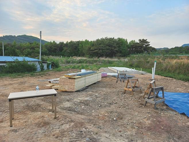 해가 뜨자마자 새벽 5시쯤 곧바로 작업 현장에 갔다. 현장은 어제 내린 비로 촉촉이 젖어 있었다. 오늘은 주말을 맞아 함께 목수학교를 다닌 동기들이 와서 도와주기로 했고 함께 벽체를 세울 계획이었다.