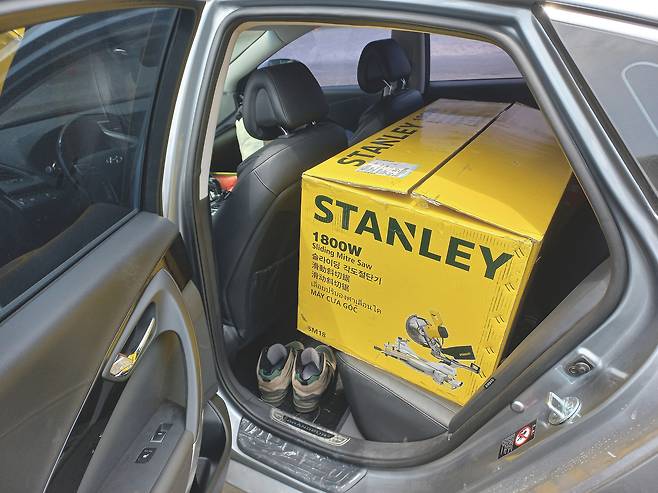 이후 각도톱의 위치를 잡았다. 톱 테이블에 긴 자재를 올려 자를 수 있도록 2×8인치 구조목으로 작업대를 설치했다. 각도톱을 설치하니 마음이 다소 안정되었다. 이제 설계대로 목재를 자르기만 하면 되었다.