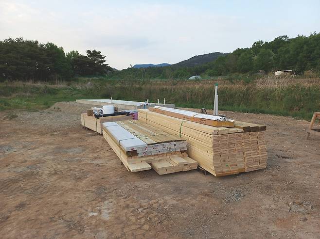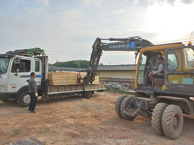 서류상으로 주문했던 터라 자재가 실린 실제 모습은 처음 보는 것이었는데 그 규모가 엄청났다. 나는 속으로 많이 놀랐지만 당황하지 않은 척 담담하게 행동했다. 자재는 지게차 대신 외삼촌이 포클레인으로 내려주시기로 했다. 물량을 보니 울퉁불퉁한 흙바닥에서 지게차로는 감당이 안 될 것 같았다. 포클레인에 주걱 대신 지게 날을 끼워 구조재의 가운데를 번쩍 들어올리니 그 어마어마한 목재 더미가 일순 떠올랐다.