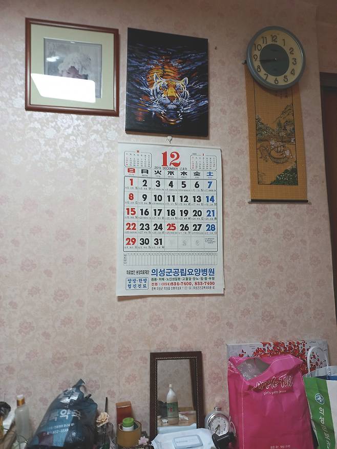 숙소에 불을 켜고 들어가니 한쪽 벽에는 3년 전인 2019년 12월 달력이 걸려 있어서 세월이 멈춘 곳 같았다. 그리고 웬 호랑이 유화 그림이 떡하니 걸려 있어서 그렇지 않아도 심란한데 마음이 편치 않았다. 처음 자는 곳이라 잠도 오지 않았다. 그래도 억지로 잠을 청했는데 보일러가 작동되는지도 몰라서 그냥 잤더니 새벽에 냉골이 되어 몹시 추웠다. 결국 거의 한잠도 못 잤다.