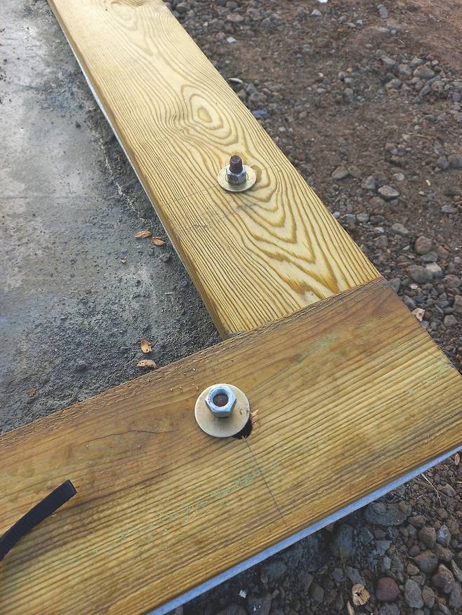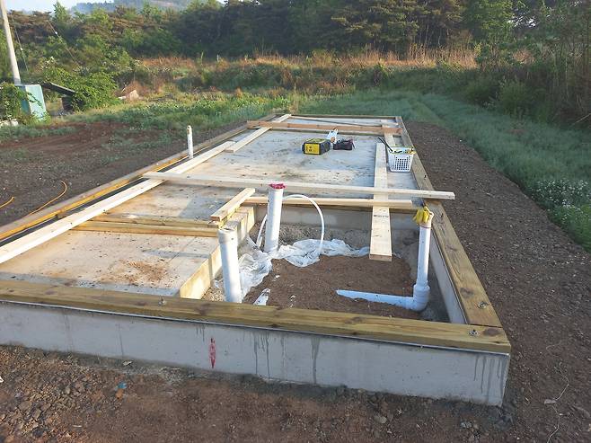 나는 급히 서둘러 어제 깔아 둔 토대 위에 구조목으로 이중 밑깔도리를 설치했다. 토대 위 튀어 나온 너트 지점에 맞춰 구조목에 드릴로 구멍을 뚫어 토대와 잘 포개지도록 올려놓고 못총으로 고정했다. 이중 밑깔도리는 벽체와 토대 사이에 들어가는 구조목으로 벽체 밑깔도리 아래 이중으로 들어간다고 해서 이중 밑깔도리로 불린다. 그렇게 벽체 아래 토대와 밑깔도리 등 3개의 구조목을 포개 쌓아 놓으면 기초 바닥으로부터 실측 4.5인치 높이가 되는데, 이 부분은 이후 보일러와 상수도 파이프를 깔고 콘크리트를 타설할 수 있는 공간이 된다.