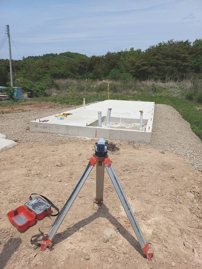 밤새 뒤척이다 아침 6시쯤 집터로 갔다. 엄청난 자재 더미에 위축됐지만 차근차근 일을 해나가기 시작했다. 먼저, 빌려온 삼각 수평계로 기초 표면 위 코너 등의 높이를 측량했다. 기초 표면 위 각 곳의 표면 높이 편차는 1인치 미만이어야 한다고 배웠는데 편차가 2cm도 되지 않아 기초공사는 비교적 잘된 것 같았다. 그래도 나는 낮은 곳에 시멘트 가루를 뿌려 높이 편차를 최대한 줄이는 작업을 했다.