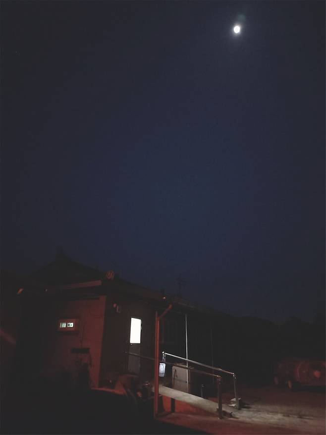 저녁 8시쯤 깊은 밤이 되어서야 마을 외딴 곳에 있는 숙소로 향했다. 숙소는 고맙게도 마을 부녀회에서 마련해 주었는데 마침 비어 있는 집이었다. 숙소에 들어가면서 하늘을 보니 달이 높이 떠 있었다. 만감이 교차했다. 공연한 일을 벌인 것은 아닌지 겁이 났다. 완수할 수 있을지 걱정도 되었다. 혼자 일을 감당하자니 외롭고 처량했다. 정말 어디로든 도망가고 싶은 심정이었다.