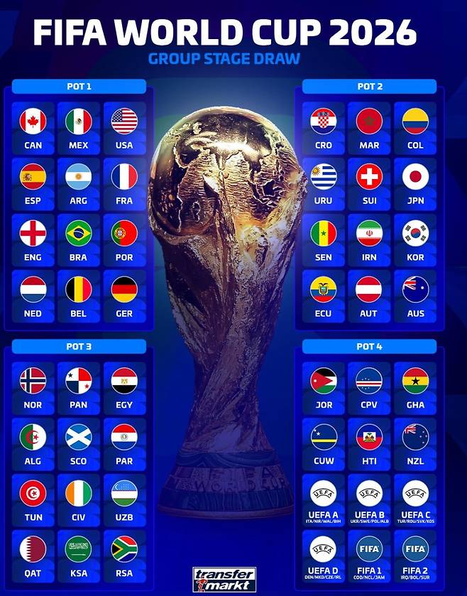 대한민국은 사상 첫 포트 2라는 강력한 출발선을 얻었다. 지역 규정으로 유럽 1개국을 피할 수는 없고 아시아 팀과도 조 편성 역시 불가능하다. 가장 이상적인 그림은 캐나다, 파라과이, 카보베르데 반대로 최악의 그림은 브라질, 모로코, 스코틀랜드(또는 유럽 PO)