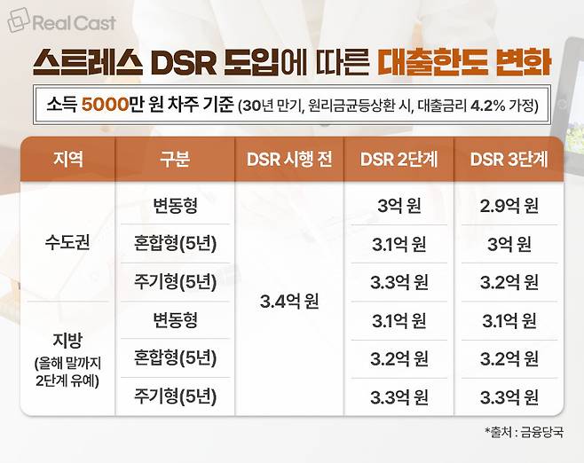 이렇다 보니 소득은 그대로지만 대출한도를 산정할 때 금리가 높게 계산되면서 DSR 비율에 맞춰 대출 원금이 적어지는 것입니다.