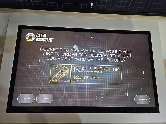 단순한 조작 보조를 넘어 실시간 진단과 부품 주문 작업도 시연됐다. 화면에는 구체적인 부품 넘버와 가격, 실시간 재고 현황까지 실시간으로 표시됐다. 작업자가 현장에서 버튼 하나만 누르면 부품 주문이 완료되는 시스템이다. 캐터필러 관계자는 "장비가 멈추는 다운타임(Downtime)은 현장의 가장 큰 적"이라며 "AI가 부품 수명을 예측하고 재고까지 파악해 주문을 제안함으로써 공기 지연을 원천 차단한다"고 설명했다.