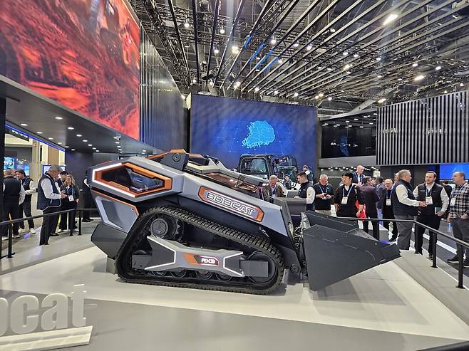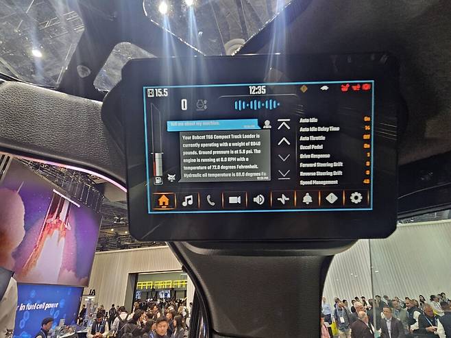 두산밥캣 전시장에 마련된 '밥캣 잡사이트 컴패니언' 체험존은 이 메시지를 생생하게 전달했다. 스키드 로더(건축 자재 등을 실어나르는 장비) 운전석에 앉아 "라이트 켜줘(Turn on the lights)"라고 말하자 거대한 굴착기가 즉각 헤드램프를 환하게 켰다.