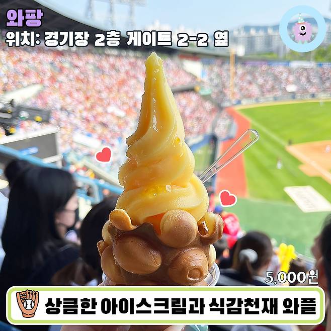 두 번째는 중간에 잠깐 빠져 나와서 구매한 와팡 <한라봉 아이스크림>이에요! 와팡 오리지널을 달라고 하면 와플만 나오기 때문에 아이스팡 또는 한라봉 아이스크림을 달라고 하셔야 해요! 먹깨비가 주문하고 있을 때 마침 홈런이 터져버려서 무지성으로 오리지널을 주문했는데, 눈치백단 사장님께서 결제 전에 여쭤보고 주문을 변경해 주셨답니다ㅋ.ㅋ