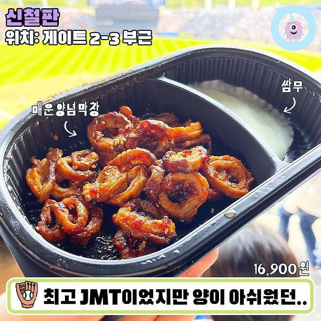 감칠맛과 불맛은 나무랄 데가 없을 정도였고, 양념이 워낙 진해서 별도의 소스 없이 쌈무에 싸 먹기만 해도 만족스러웠어요. 아마 맛있어서 양이 더 적게 느껴졌을 지도 모르겠어요;; 가성비, 가심비 상관 없이 최고의 경기를 보며 최고의 맛을 느끼고 싶다면 신철판 막창도 추천입니다!