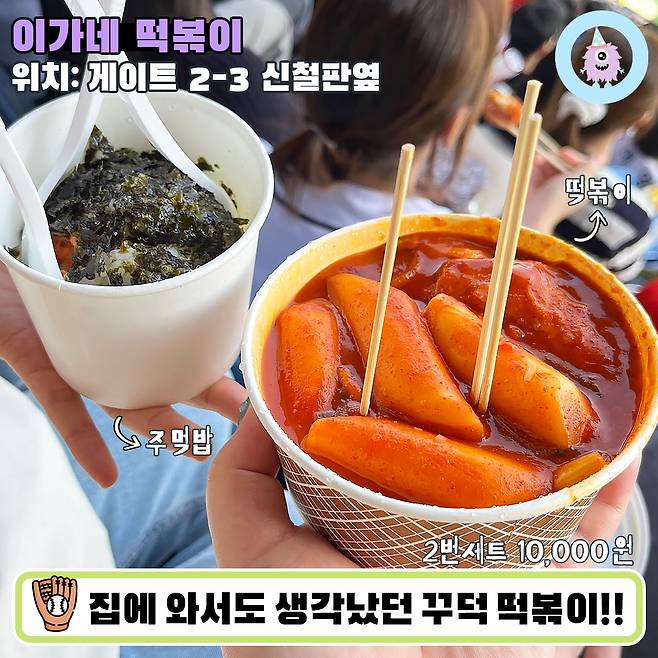 이가네 떡볶이는 게이트 바로 앞 신철판 옆에 위치해 있어요. 역시 좌석에 따라 미리 구매해서 입장하시면 좋을 것 같아요!