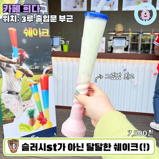 다섯 번째는 잠실원샷 옆 카페 희다에서 구매할 수 있는 <야구방망이 쉐이크>에요! 리스트에 넣을까 말까 고민을 많이 했지만 분명히 야구장에서만 느낄 수 있는 재미라고 생각되어 픽했답니다:) 이미지만 보고 시원한 슬러시를 상상했는데 여리여리한 컬러의 딸기쉐이크가 담겨서 나왔어요!