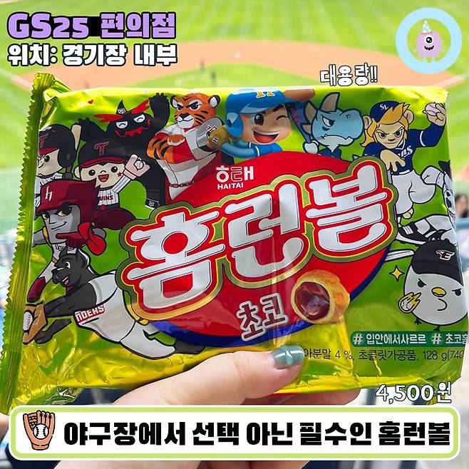 마지막은 야구팬이라면 빼놓을수 없는 <대용량 홈런볼>이에요! 경기장 내부 GS25 편의점에서 구매할 수 있고 가격은 4,500원이었어요! 이날 잠실야구장에서 제일 많이 본 간식이 홈런볼이었는데요. 그만큼 응원하는 팀의 홈런을 바라는 야구팬들의 마음이 간절하다는 뜻이겠죠?