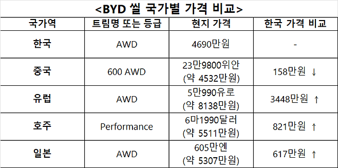 BYD코리아가 중형 전기 세단 '씰(SEAL)'의 사륜구동(AWD) 모델을 유럽·일본 등 주요 해외 시장보다 최대 3000만원 이상 저렴한 가격에 출시했다. 가격 경쟁력은 분명하다. 다만 중국에서는 이미 2025년형 신형 모델이 판매 중인 데 비해, 국내에는 2022년 출시된 구형 모델이 도입돼 형평성 논란이 일고 있다.