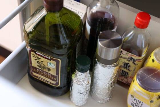 올리브오일은 서늘하고 빛이 차단되는 장소에 보관하는 것이 기본이다. 찬장이나 싱크대 하부장처럼 온도 변화가 적은 공간이 적합하다.