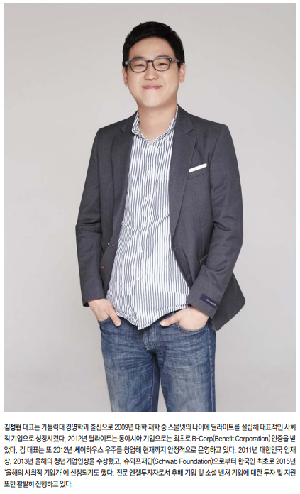 주택 공유 중개 업체 ‘셰어하우스 우주(WOOZOO)’로 주가를 높인 김정현 대표는 대학생이던 2010년 벤처기업 ‘딜라이트’를 창업했다. 저소득 난청인들을 위해 시중에서 판매하는 보청기의 3분의 1밖에 안 되는 저가 보청기를 개발, 판매해 큰 인기를 얻었다. 그로부터 1년 뒤, 그는 이 회사를 중견 제약사 대원제약에 40억 원에 매각했다.