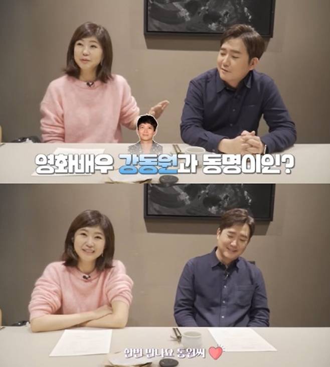 강동원은 자신과 동명이인인 영화배우 강동원에 대해 "영광이다"라고 말했고, 강수정은 오빠의 말에 "사회생활 잘하네?"라면서도 "사실 그분 덕분에 오빠 이름을 사람들이 빨리 기억하게 됐다"고 말했다.