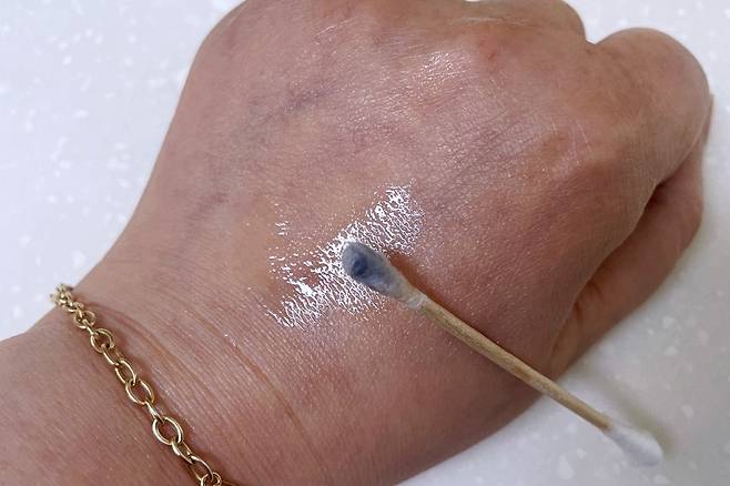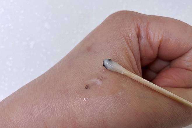 방법은 처음처럼 면봉에 선크림을 묻혀 닦아만 주시면 되는데요. 유성매직이 금새 지워지는 것을 확인할 수 있습니다.