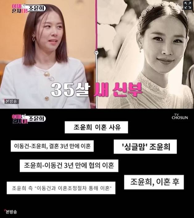 배우 조윤희가 최근 출연한 한 방송프로그램에서 전남편인 배우 이동건과 이혼한 이유를 고백해 시선이 쏠리고 있습니다.