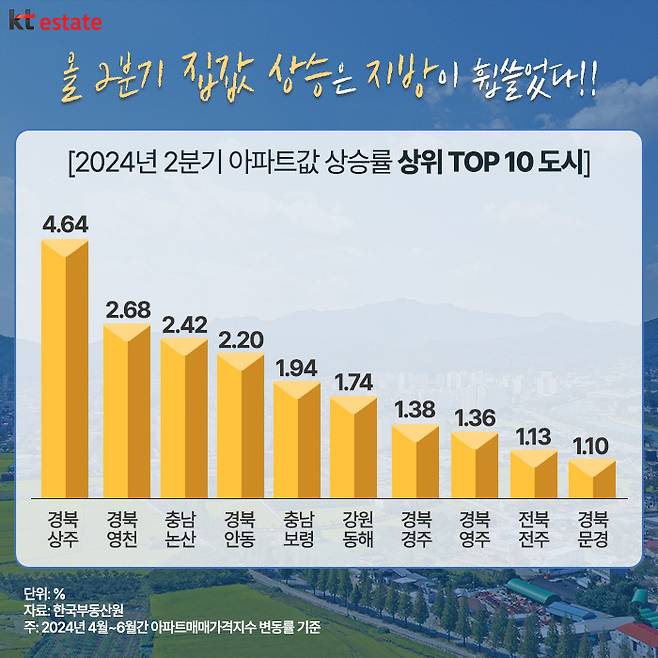 한국부동산원의 월별 아파트 매매가격지수 자료에 따르면, 지난 2분기(2024년 4~6월) 전국에서 아파트값이 가장 많이 오른 지역은 경북 상주시로, 3개월 동안 무려 4.64% 상승했습니다. 2위를 차지한 경북 영천시(2.68%)와 비교해 2%p가량 높아 압도적인 1위를 차지했습니다.