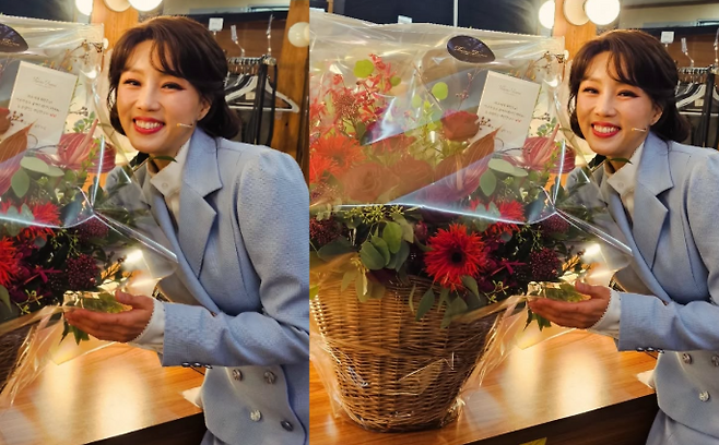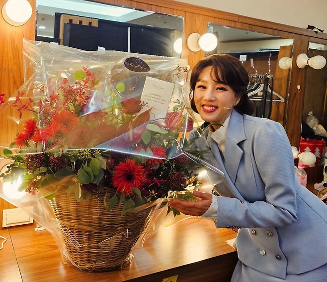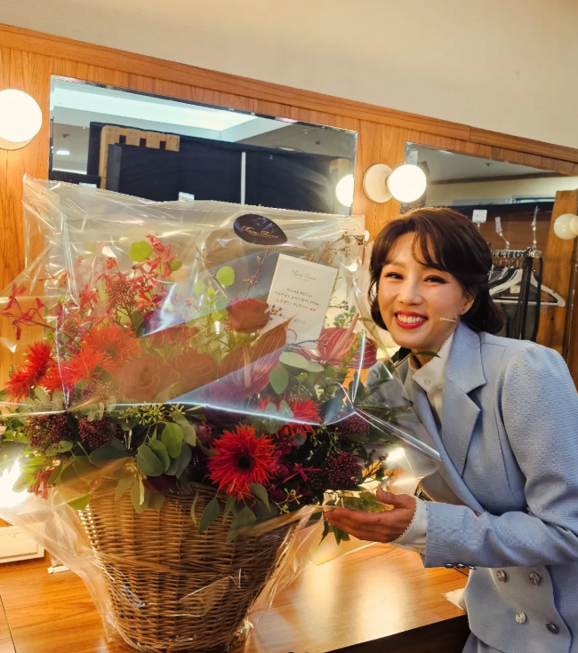 최현주는 하늘색 자켓과 하의를 매치해 깔끔하면서도 산뜻한 무드를 연출했습니다. 자켓 안에는 흰색 티셔츠를 매치해, 시원하면서 세련된 룩을 완성했습니다. 하늘색의 자켓은 그녀의 밝은 이미지를 강조하며, 상큼한 스타일이었습니다.