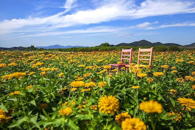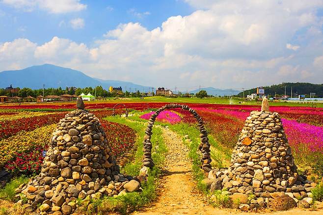 여름이 시작되면 형형색색의 백일홍과 노랑빛 해바라기가 만개하고 꽃 군락을 배경으로 화사하고 다채로운 작품을 남길 수 있습니다. 제주도에서 볼법한 돌탑과 입구가 만들어져 이국적인 분위기를 선사합니다.