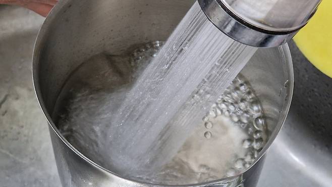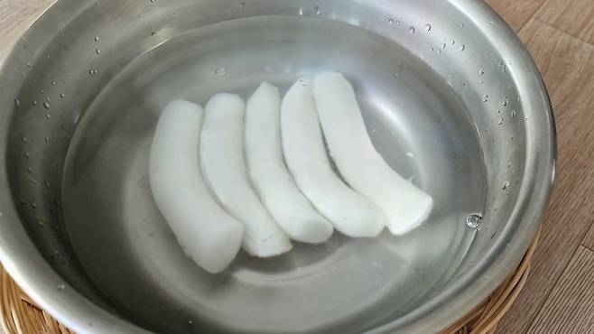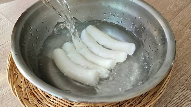 이제 가래떡이 잠길 수 있도록 뜨거운 물을 부어 놓으세요.