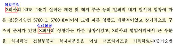 이어 "제일모직의 영업이익에서 큰 부분을 차지하는 건설 부문과 식자재 부문은 어닝서프라이즈를 기록했다"고 판시했다.