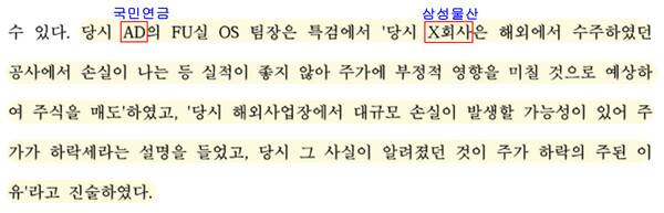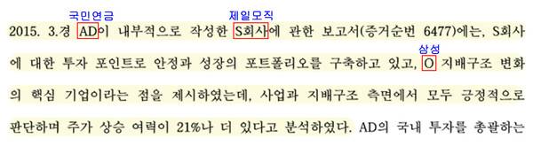 또 재판부는 "JP모건이 제일모직에 대해 매도의견 리포트를 내놓았지만, 발행 직후 제일모직 주가는 약 28% 상승했다"며 "외국인투자가들은 씨티증권 매도 리포트가 나온 후 합병 전까지 상당한 액수를 순매수한 것으로 보이고 당시 제일모직을 긍정적으로 평가했던 많은 국내 증권사들의 리포트들이 존재한다"고 덧붙였다.