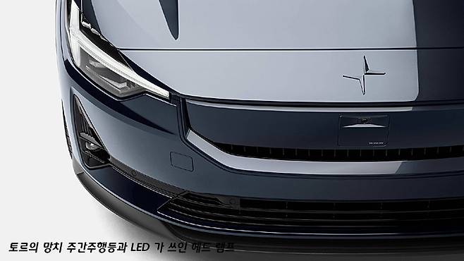 폴스타2의 앞 모습에서는 장방형의 라디에이터 그릴 프레임과 일명 토르의 망치라고 불리는 옆으로 누운 T 형태의 주간주행등이 눈에 들어옵니다. 이 주간주행등 디자인은 폴스타 브랜드의 모기업 볼보에서 유래된 것인데요, 그걸 쓰면서도 폴스타는 볼보와의 연관을 약간 부정하는 듯한 인상을 줍니다.