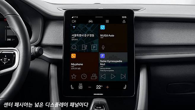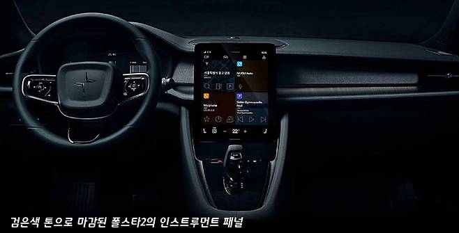 이런 디지털적 미니멀 감성은 실내 디자인에서도 이어집니다. 무채색의 검은 색이 주조이면서 수평 기조의 인스트루먼트 패널 역시 팽팽하게 당긴 탄력 있는 면들로 구성된 형태입니다. 운전석 속도계 클러스터는 최근의 경향 대로 풀 디스플레이 패널이 들어갔지만, 속도계 부분에 마치 태블릿을 올려놓은 것 같은 형태로 디자인하는 다른 메이커들과는 달리 폴스타2의 클러스터 후드 형태는 기존의 아날로그 계기판을 장착했던 시대의 차량들과 비슷한 이미지입니다.