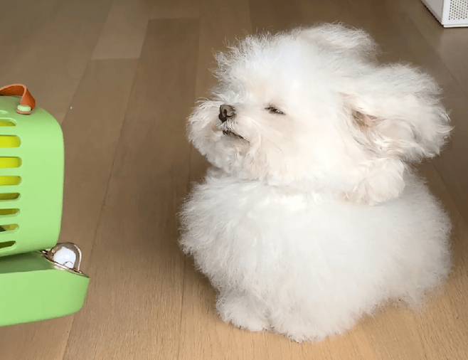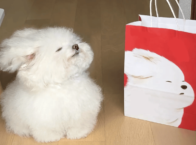 선풍기 바람에 날리는 털 모양이 쇼핑백에 그려진 강아지 일러스트와 똑같습니다!
