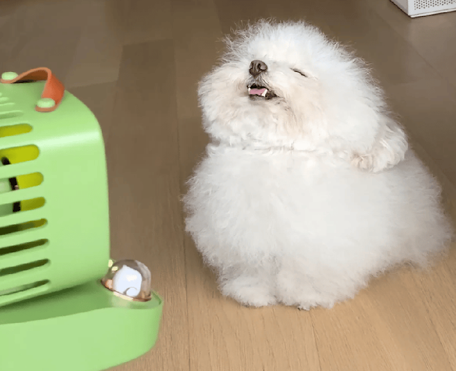 어느 견주는 집에 있는 강아지를 위한 특별한 작은 선풍기를 구입했습니다.