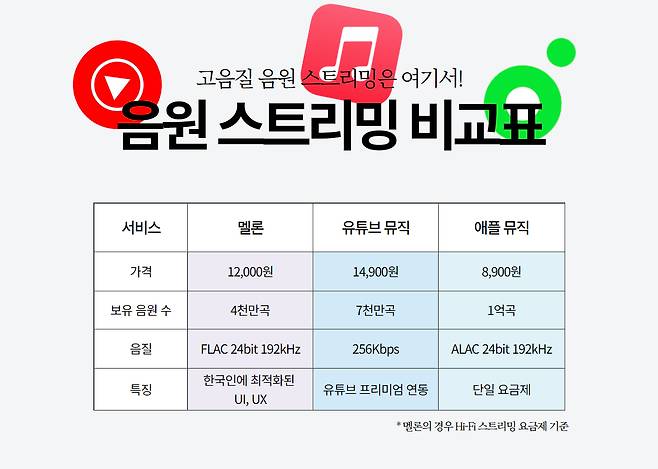 반면 멜론은 최대 FLAC 24비트 192kHz로 음원을 감상할 수 있다. 4천만곡을 보유했는데, 유튜브 뮤직보다는 확실히 곡의 종류가 부족하다고 느껴진다. 가격은 월 구독 기준으로 12,000원. UI, UX가 한국인이 사용하기에 최적화되었지만 다른 스트리밍 서비스에 비해 사용자 맞춤 곡 추천 기능이 아쉽다는 평이 많다.