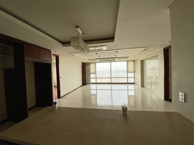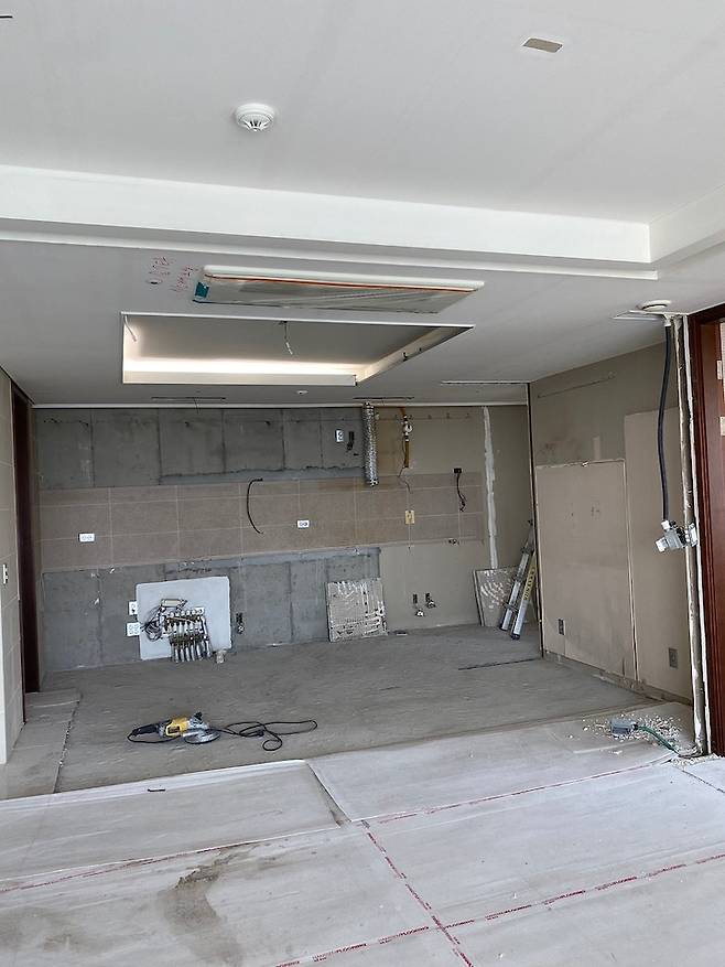 주방 가구를 모두 철거한 상태예요. 주방 우물 천장은 목공으로 평탄화 마감을 하고, 우측에 냉장고, 김치냉장고 자리를 철거해서 아일랜드를 3100까지 뺄 수 있었어요.