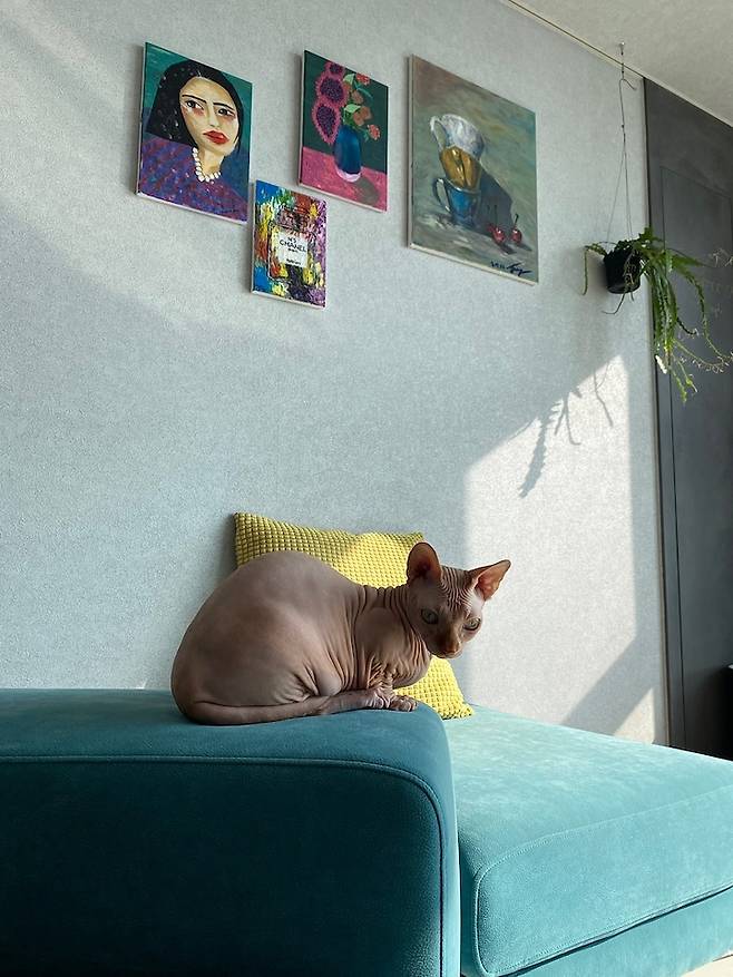 그레이와 그린의 조화가 제법 잘 어울려요. 우리 막둥이 치미의 핑크까지 더해서 사랑스런 갤러리존입니당.