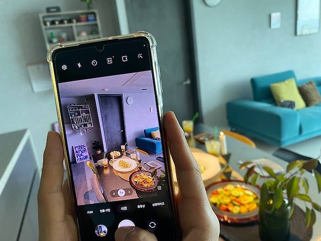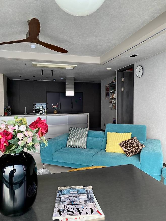 스댕까지 더해져 공간이 더 유니크하게, 멋스럽게, 시크한 거실 공간이 되었어요. 탁 트인 조망으로 테이블을 주방에도 두었다가 거실 창가에도 두기도 해요. 그때 그때 기분에 따라 작은 변화를 주고 있어요.